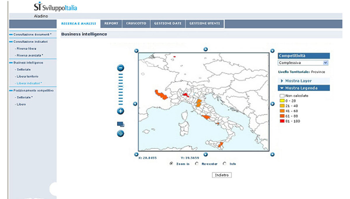 Aladino è il sistema informativo Web Oriented realizzato per Sviluppo Italia a supporto del processo di attrazione degli investimenti dall’estero. Capace di garantire l’organizzazione e la gestione delle informazioni utili alla conoscenza e all’analisi di un territorio, Aladino è uno strumento interattivo che consente la misurazione della competitività del territorio italiano rispetto alle investment location estere.