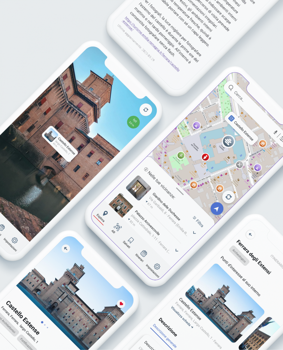 - App. Sviluppare una applicazione mobile, scaricabile dai principali store digitali, in grado di accedere direttamente alle informazioni archiviate nel repository centralizzato. L’app è stata progettata per garantire semplicità d’uso e per offrire un’esperienza di visita immersiva e completa, integrando mappe, contenuti multimediali e strumenti innovativi di interazione.