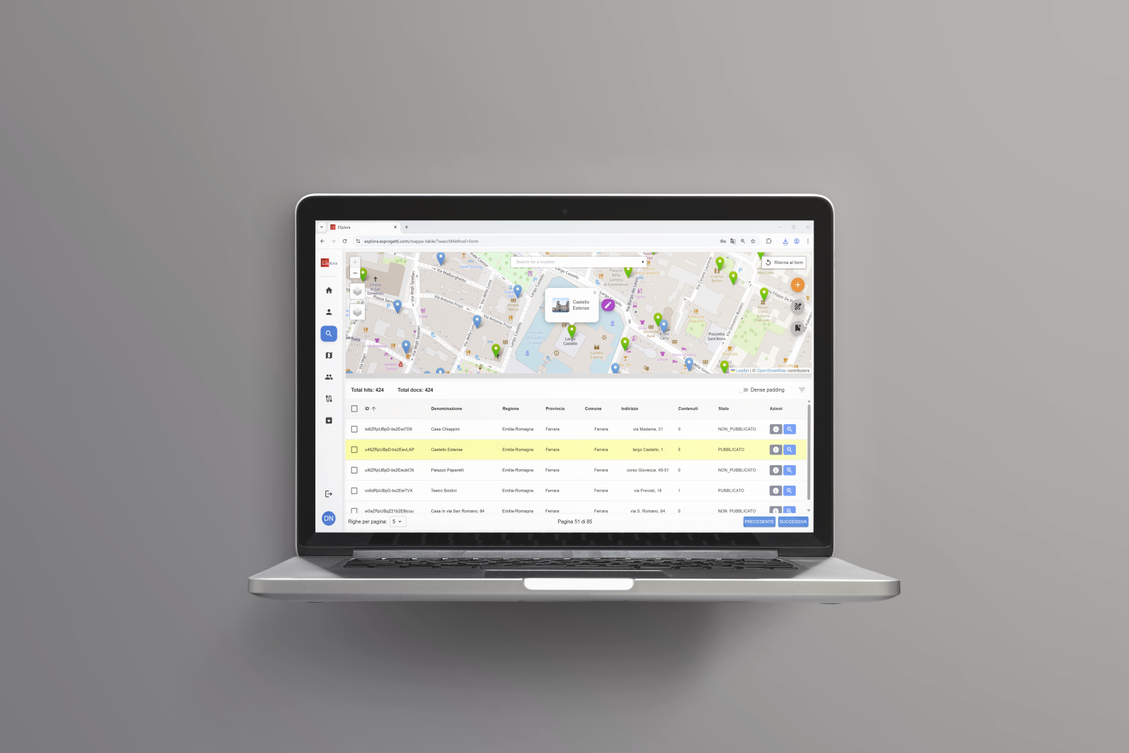 I tracciati record di ESplora non seguono gli standard catalografici ICCD, tipici delle piattaforme di tipo museale o archivistico, ma sono stati appositamente progettati con un criterio diverso: privilegiare le performance e al tempo stesso garantire una gestione efficace dei contenuti in modalità multilingua, requisito fondamentale per la fruizione internazionale del sistema.