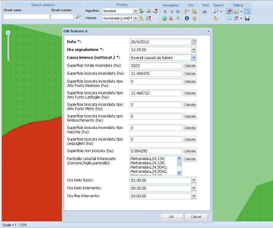 Il Sistema informativo geografico fornisce le fondamentali funzionalità di supporto alla gestione delle Emergenze da incendi Boschivi. Una specifica funzionalità di routing (implementata con algoritmo Dijkstra, tiene conto delle limitazioni di accesso dovute dalle dimensioni del mezzo e dell’accessibilita delle strade) consente di individuare il tragitto più veloce per poter raggiungere il luogo dell’incendio, indicato dalla Sala Operativa Centrale del Coordinamento Provinciale.